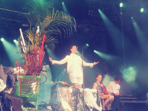 Jeg rakk se to bisarre minutter av Nils Bech på Roskildes minste scene. Da jeg så det også var palmer i handlevogn på scenen her visste jeg likevel ikke hvilken vidunderlighet jeg gikk til.